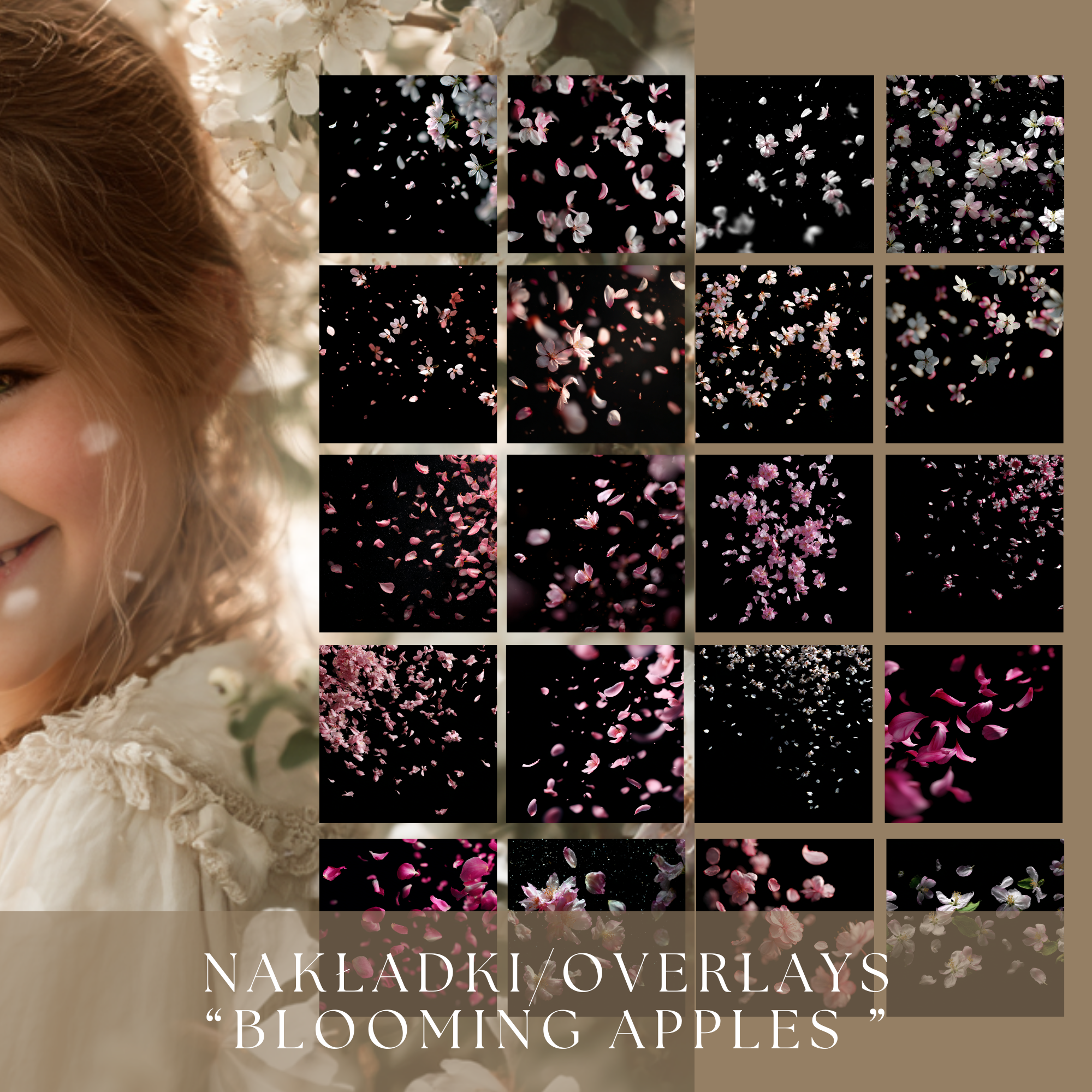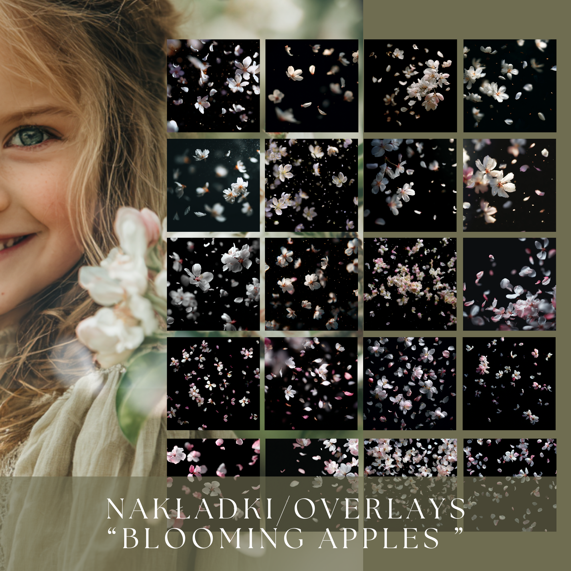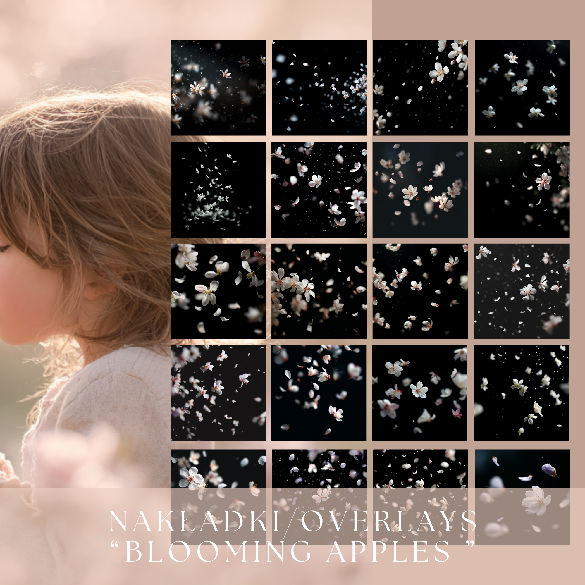 Blooming Apples Overlays to kolekcja 60 subtelnych, świetlistych nakładek z płatkami kwitnących jabłoni i wiśni, które dodają zdjęciom lekkości, romantyzmu i naturalnego ruchu.